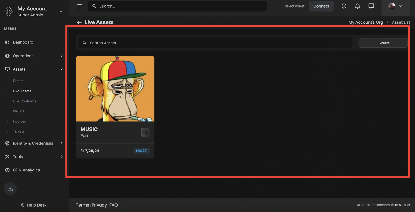 Select an Asset: Click on any asset to view its detailed information. This includes the asset's image, name, minting fee, contract type, and creation date.