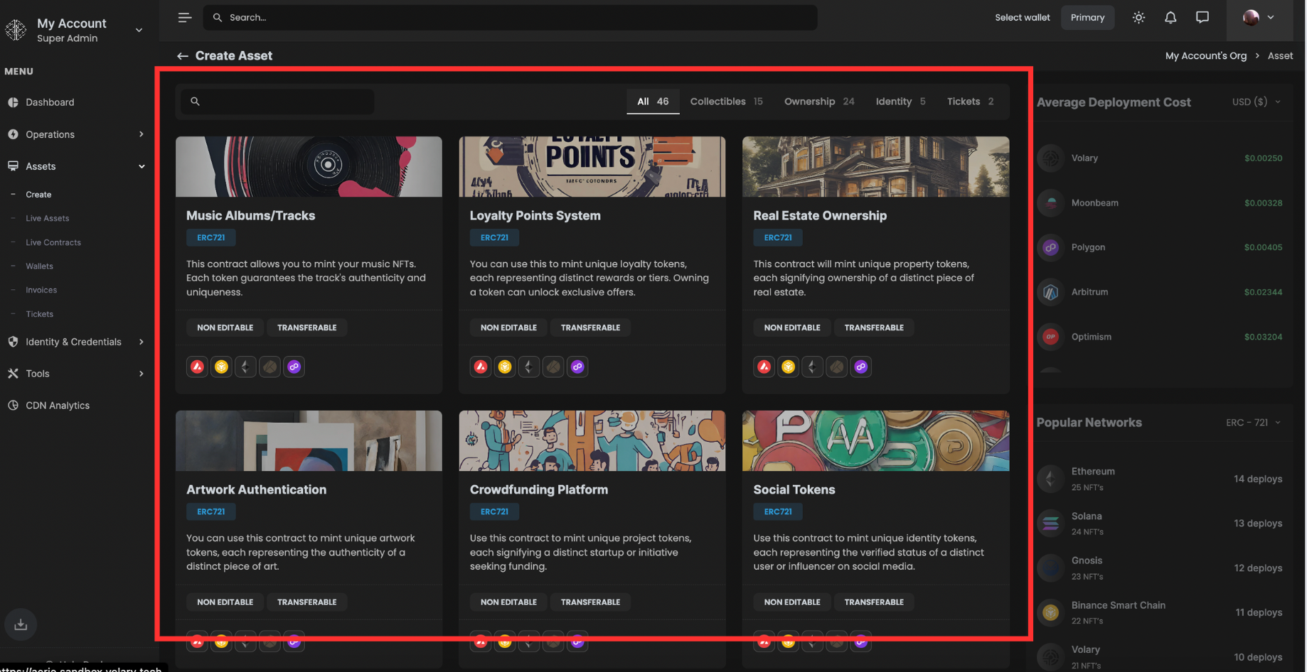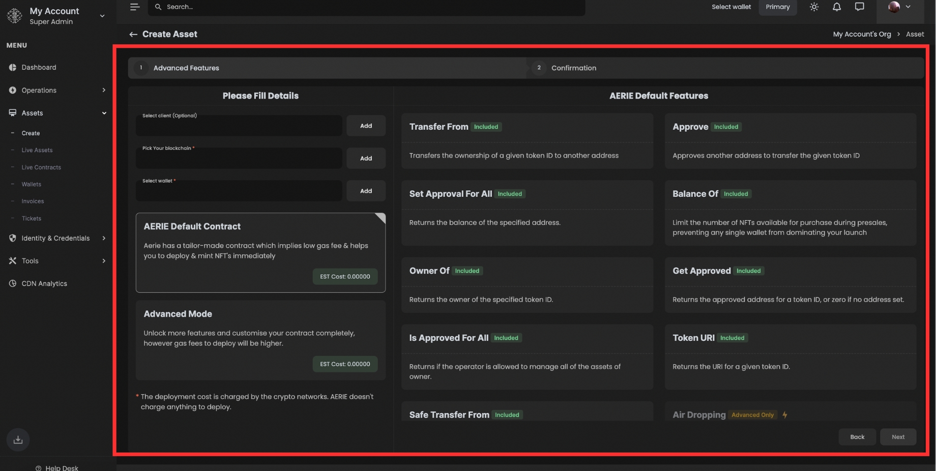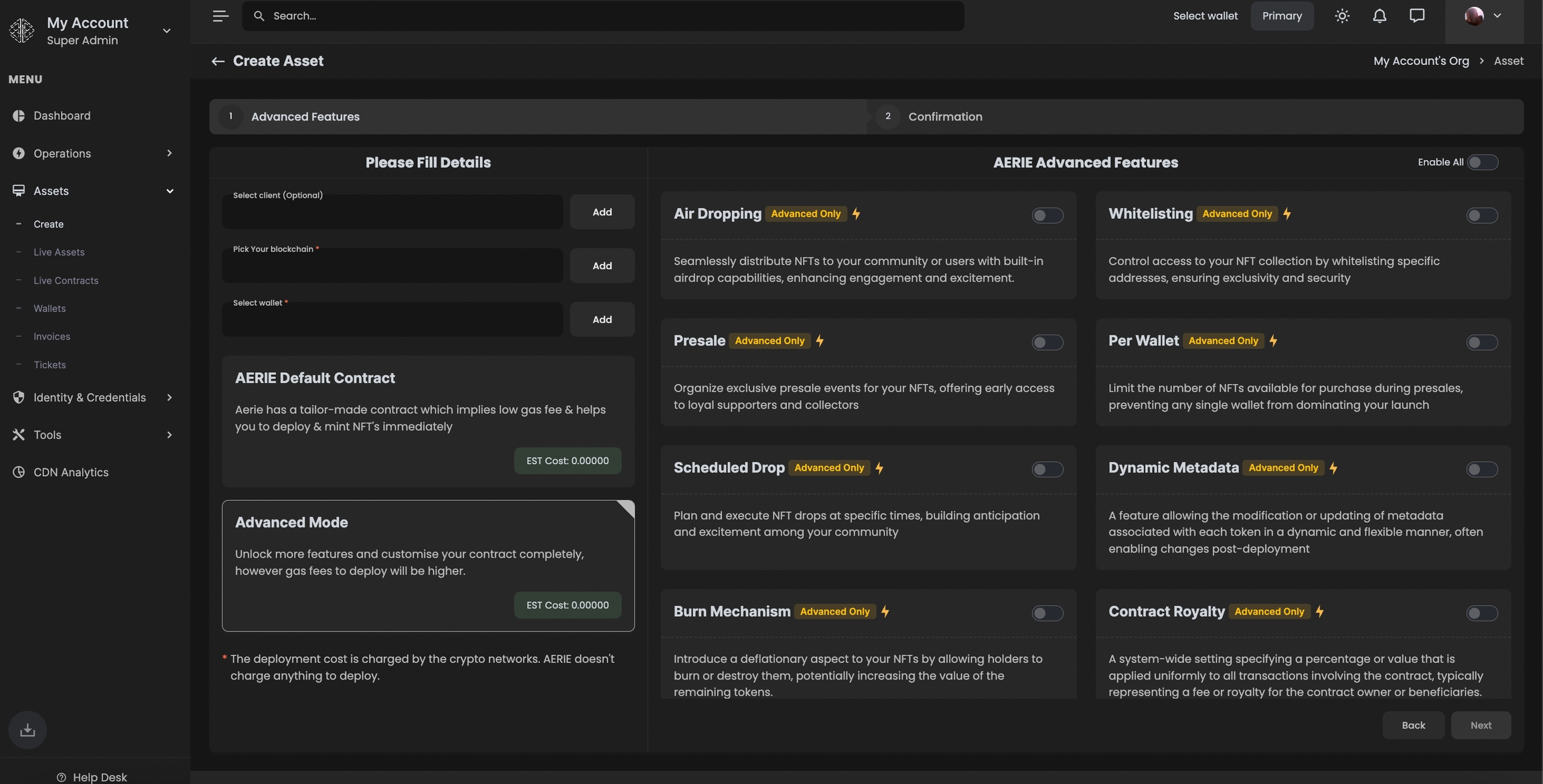 Aerie allows users to create assets through a comprehensive process to deploy a wide variety of NFTs using predefined templates.